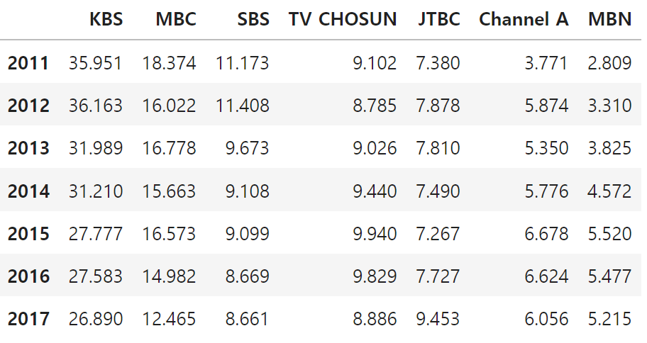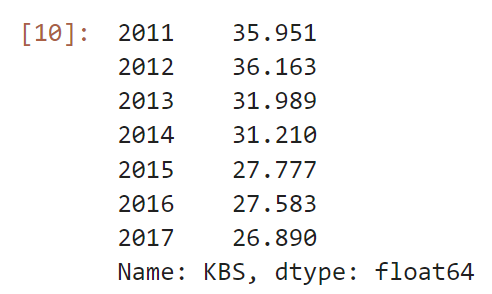 df의 KBS column만을 보도록 작성한다.