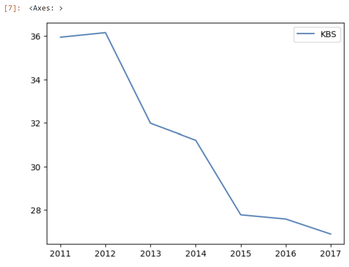 1차원에 대해서도 plot을 사용할 수 있다. KBS의 연도별 시청률이 선 그래프로 그려진다.