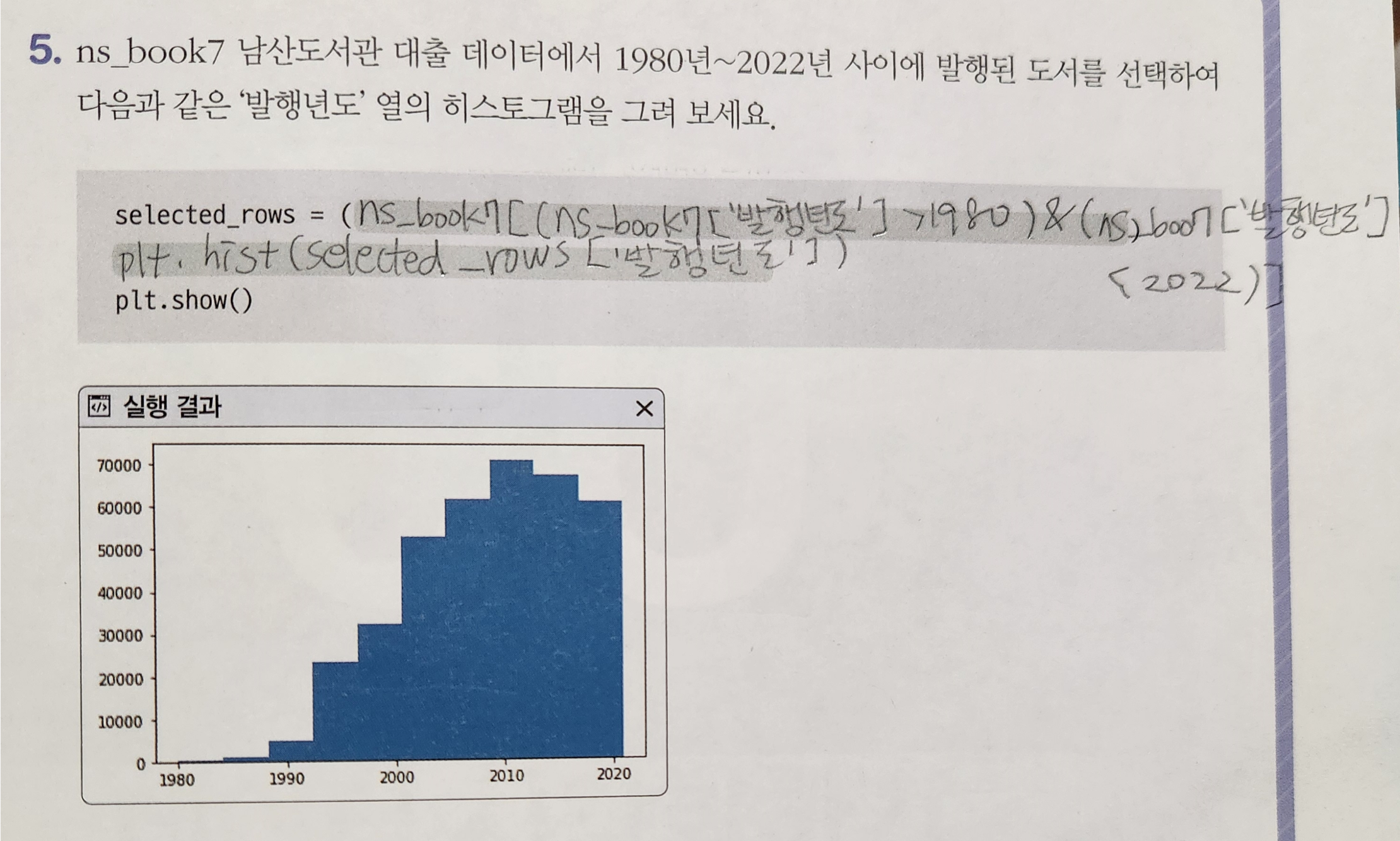 정답 코드는 Boolean indexing을 사용하여 조건을 만족하는 행의 발행년도 데이터로 히스토그램을 생성하고