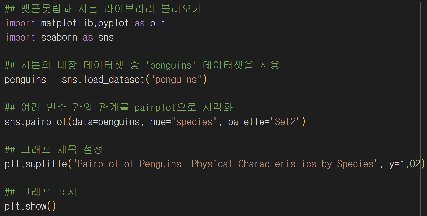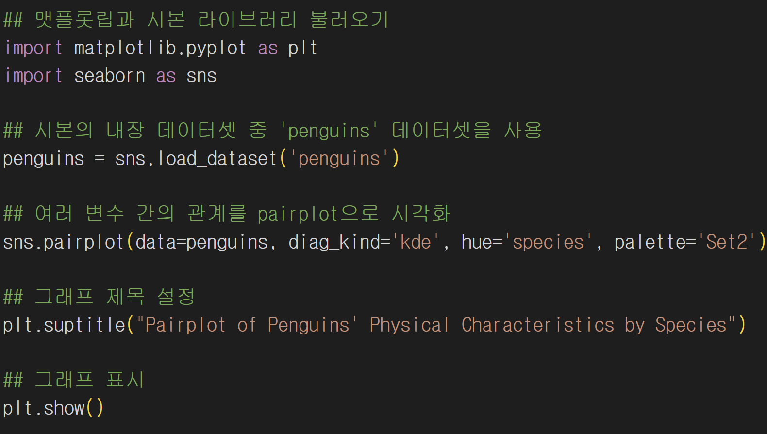 penguins 데이터셋의 변수들이 연속형이기 때문에 자동값이 kde로 설정되어 따로 지정하지 않아도 되는 것을 알게 되었다.