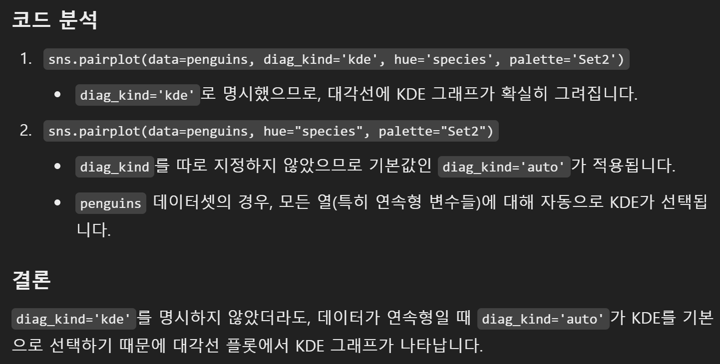 diag_kind를 kde로 따로 지정해줬는데 안 했는데도 자동으로 kde가 나오는 이유를 챗gpt에게 물어봤다.