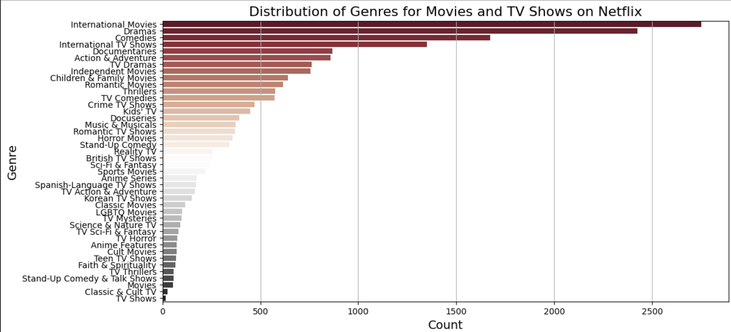 가장 큰 비중을 차지하는 장르를 알 수 있다. 드라마와 국제 영화에 집중되어 있다.
