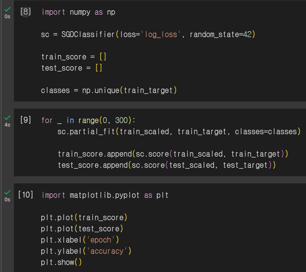 추가 숙제(선택): Ch04(04-2) 과대 적합 / 과소 적합 손코딩(p.220) 하고 코랩 화면 캡처하기