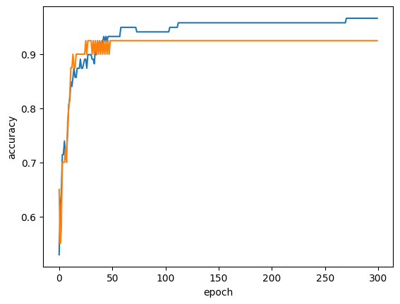 위 코드는 에포크를 0에서 300까지로 학습시켰을 때의 훈련 세트와 테스트 세트에 대한 정확도를 그래프로 나타낸것이다.