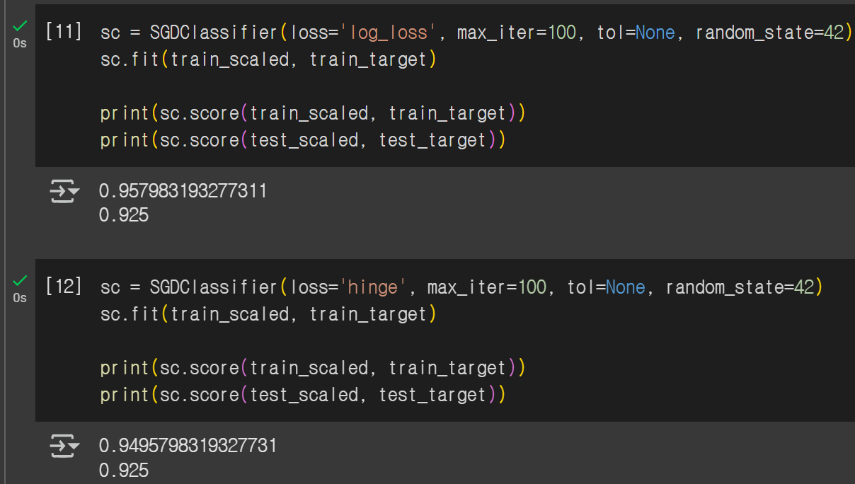 에포크를 100으로 하고 학습시켰을 때의 점수를 출력해보면, 훈련 세트의 경우에는 약 0.96, 테스트 세트의 경우에는 약 0.93으로 훈련 세트의 점수가 테스트 세트보다 살짝 크고 둘 다 그렇게 작지는 않은 적절한 점수가 나온 것을 확인할 수 있다.