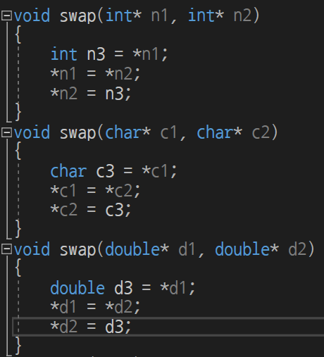오버로딩을 할려면 매개변수의 개수가 다르거나 자료형이 달라야 한다. main 함수에서 swap은 각각 두 개의 매개변수를 다 다른 자료형으로 사용하고, &을 사용했기 때문에 *을 이용하여 위와 같이 코드를 짜면 된다.